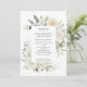 O convite para o casamento apresenta um design romântico e elegante, com um quadro generoso de flores brancas e cremosas, como rosas e peões, intercalados com eucalipto e bagas brancas. O aspecto geral é suave, encantador e perfeito para uma celebração refinada. Fácil de personalizar com suas informações.