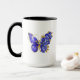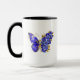 Borboleta de flores cinza, azul, safira, espumante com asa decorada com flores preciosos azuis com folhas de ouro sobre fundo branco.