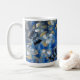 A pintura apresenta borboletas pretas delicadamente espalhadas sobre um fundo azul abstrato. Os tons azuis vão desde índigo profundo a azul-céu macio, criando uma atmosfera como sonho. As borboletas, estreladas em contraste, estão em várias posições — algumas em voo, outras em repouso — acrescentando um senso de movimento à composição. O fundo, texturizado com pinceladas e gradientes sutis, evoca um sentimento de profundidade e serenidade, enquanto as borboletas negras se destacam como figuras elegantes e misteriosas, trazendo um toque de contraste.