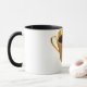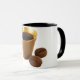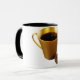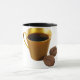Essa imagem mostra uma caneca de cerâmica branca com interior e alça pretos, apresentando um impressão na moda de uma xícara de café ouro cheia de cerveja escura, acompanhada de dois grãos de café realistas. O elegante e minimalista design faz dele um presente perfeito para amantes de café ou como um complemento chique para qualquer cozinha ou escritório — ideal para apreciar seu fôlego matinal favorito no estilo.