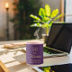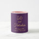 Simples e elegante caneca de 50 anos. Cor de fundo púrpura escura e feminina. Com o texto: 50 e fabuloso. Modelo para nome e data. Ouros.