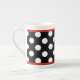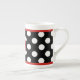 Caneca preto e branco da porcelana das bolinhas do divertimento, com uma banda vermelha fina, na parte superior e na parte inferior do teste padrão de bolinhas. Um disco vermelho, na parte dianteira do copo, tem um um monograma branco da letra. Personalize a letra para o senhor mesmo ou como uma grande ideia do presente. Copo bonito para seu café ou chá da manhã.