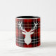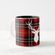 Caneca temático clássica do Natal e de café do Dois-Tom dos feriados de inverno. Cervos brancos no teste padrão vermelho da xadrez.