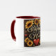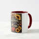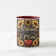 Este design de caneca quente e alegre mostra a frase sentida "Bendida por ser chamada de mãe" em um roteiro elegante e fluente. O design é lindamente adornado com girassóis amarelos brilhantes, corações vermelhos vibrantes, e delicados sotaques giratórios contra um fundo marrom rico. Os girassóis trazem um toque de alegria e calor, enquanto os corações simbolizam amor e afeto. Esta design de caneca exprime maravilhosamente gratidão e a bênção de ser mãe, fazer-a de um adorável presente de dia de as mães e de uma caneca dia de as mães corajosa.