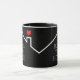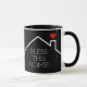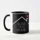 Um coração vermelho sobre o telhado de uma casa com as palavras "Abençoe esta casa!" aparece na frente e atrás desta caneca. MUDE A COR DE FUNDO para qualquer coisa - mostramos preto.