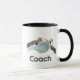 Fotografia de um apito prateado impresso em ambos os lados da caneca com texto personalizável, "Treinador". Dê ao seu treinador trabalhador, paciente, encorajador, motivador algo especial. As palavras podem ser feitas de forma menor, diferente, diferente texto ou diferente. Eles podem ser movidos em qualquer lugar da caneca se a ferramenta de edição for usada. Estilo, cor e tamanho de mug também são personalizáveis. Enlouquecer e torná-lo único ou ficar com o design como ele é.
