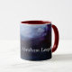 Linda caneca em abstrato púrpura, azul e branca. Personalizada com seu nome.