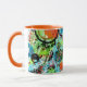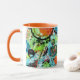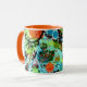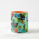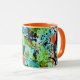 Abstrato em tons vivos de turquesa, lacre, laranja, laranja, vermelho, preto, branco, ouro metálico e tons de verde.