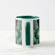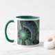 Coffee mug com "Cosmic Pod", abstrato, copyright © 2008, Susan Wallace. Um padrão labiríntico circular em tons de verde e azul, combinando formas geométricas em um design futurista complexo.