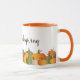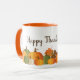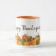 Esta caneca de café cerâmica é mostrada com uma queda de outono. As abóboras de Ação de Graças são design de impressão. Personalize este item ou comprar como está.