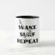 Esta xícara apresenta um design gráfico dinâmico de um acordar surfando, com uma onda estilizada abaixo e um pássaro voando sobre o alto. As palavras "REPEAT do SURF do ACORDAR" são exibidas de forma destacada, acima e abaixo do surfista, em letras maiúsculas a negrito. Este design capta a emoção e o entusiasmo da surfe em acordares, fazer-o como uma escolha perfeita para os entusiastas de esportes aquáticos.