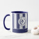 Uma simples caneca de café moderna para um cabeleireiro barbeiro em faixas azuis brancas e escuras de marinho com logotipo de tesoura. Fácil de personalizar com o nome de sua empresa ou lista de penteados e com o logotipo de sua própria empresa.