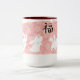 Estes coelhos pequenos desejam-lhe a "boa fortuna" quando você apreciar sua bebida favorita. São tirados em um estilo esboçado rápido e apresentados contra um teste padrão especialmente projetado do papel-estilo do washi em um fundo do brushstroke. Este teste padrão do washi caracteriza sakura cor-de-rosa contra um rosa mais escuro textured. O kanji que acompanha os meios "boa fortuna".