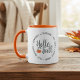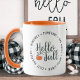 Esta caneca de dois tons apresenta um belo roteiro "Hello Fall" em um círculo de atividades favoritas do outono: Bonfire, Pumpkins, Hay Rides, Apple Cider e Cozy Sweater.