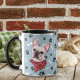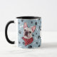 Esta caneca para o dono do Bulldog Francês apresenta um retrato de aquarela de um adorável francês branco vestindo um cachecol vermelho com um padrão de ossos dourados. A imagem é impressa duas vezes, e entre elas está um oval com o texto preto que diz "Love my Border Collie". As imagens ovais e de cães são colocadas sobre um fundo azul de cinza coberto por estampas pretas e ossos brancos. Você pode facilmente mudar o texto para outra coisa, ou personalizá-lo, se quiser.