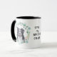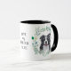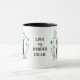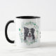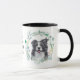 "AMA MEU COLLIE FRONTEIRIÇO" declara esta caneca para o amante do Cachorro da Fronteira. Cada lado da caneca tem um belo retrato aquoso de um collie preto e branco em uma coroa azul verde. Entre as duas imagens está o texto, que pode ser facilmente personalizado, ou mesmo removido, por você.