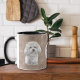 Esta caneca para o dono do Cachorro Bichon Frise apresenta um retrato de aquarela de um adorável Bichon. A imagem é impressa duas vezes, e entre elas está um oval com o texto preto que diz "Love my Bichon Frise". A imagem oval e do cão é colocada sobre um fundo bronzeado, coberto de corações e estampas de pata. Você pode facilmente mudar o texto para outra coisa, ou personalizá-lo, se quiser.
