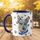 Esta caneca para o dono do Cattle Dog australiano mostra o retrato aquoso de um artista de um lindo Cão azul e bronzeado vestindo um colar azul. A imagem é impressa duas vezes, e entre elas está um oval com o texto preto que diz "Love my Cattle Dog". As imagens ovais e de cães são colocadas sobre um fundo branco aspergido com estampas pretas. Você pode facilmente mudar o texto para outra coisa, ou personalizá-lo, se quiser.