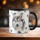 Esta caneca para o dono do Cachorro Siberiano apresenta o retrato aquoso de um artista de um belo Rouco. A imagem é impressa duas vezes, e entre elas está um oval com o texto preto que diz "Ame o meu Rouco Cachorro". As imagens ovais e de cães são colocadas sobre um fundo aspergido com estampas pretas. Você pode facilmente mudar o texto para outra coisa, ou personalizá-lo, se quiser.