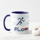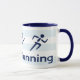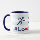 Não apenas goste de correr: #LoveRunning! Uma caneca para qualquer um - um corredor de maratona, triatlo ou atleta de atleta, corredor internacional, ou para alguém que apenas gosta de manter o ajustado. Texto simples em marinho com um coração vermelho, e três pictogramas acima, em um fundo listrado azul pálido.