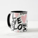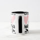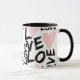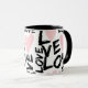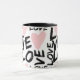 Uma tomada moderna do amor, com uma fonte preta rabiscada e corações cor-de-rosa pálidos desenhados à mão, lembrando a famosa escultura "LOVE" da década de 1970.