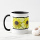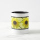 Uma caneca alegre com girassóis dirige em um fundo cruzado preto e amarelo. A caneca da campainha é acentuada no preto, mas pode "ser personalizada" a uma outra cor.