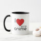 Isto "eu amo o anime" ou "eu design do anime do coração" tenho uma pia batismal preta arredondada moderna e um grande coração vermelho. Igualmente mostra a palavra "anime" na pia batismal japonesa das cinzas dos Hiragana.