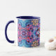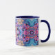 Esta caneca impressionante apresenta uma tela mesmerizante de mandala geométrica azul e rosa, com cores vibrantes e formas intrincadas que cativam seus sentidos.