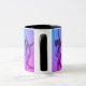 Uma imagem repetida colorida, azul e roxa, de um macaco-aranha juvenil numa caneca de café com um cabo preto e dentro contrastante. Imagem tirada de um desenho original do meu macaco-aranha.