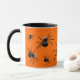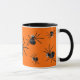 Use esta caneca de aranha de inseto bobo quando você fizer truques ou tratar no Halloween ou em qualquer época do ano. Eles não assustarão ninguém, mas você tem certeza de que vai rir muito. Aranhas pretas com olhos brancos esfregando-se em suas cabeças estão espalhadas em um fundo laranja.