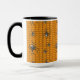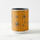 Um fundo laranja brilhante cria uma base perfeitamente temática no Halloween para um padrão repetido de teia negra rastejando com aranhas. Essas aranhas, modeladas após a falsa viúva, apresentam um crânio branco brilhante em seus abdômen e outras marcas brancas em seu corpo e pernas. Esta caneca está disponível em várias cores, tamanhos e estilos, incluindo canecas de viagem e canecas de cerveja.