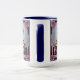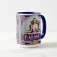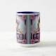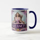This mug features a stylized Art Deco illustration of a woman in a lotus meditation pose centered within an ornate geometric frame. The woman wears a flowing pink silk dress with a deep V-neckline and is seated in an ornate gold and teal colored chair. Her long brown hair flows outward in a wind-blown motion, and her eyes are closed in serenity with hands in meditation mudras. The background features a soft blue gradient. The frame consists of Art Deco geometric patterns in purple, pink, and gold, including radiating fan shapes and angular designs. At the bottom of the image is a dark purple banner containing the word BALANCE in metallic silver and lavender Art Deco-style lettering. The image is on both sides of the mug. The mug is a navy blue combo mug. The mug is a fifteen ounce mug.
