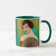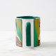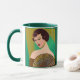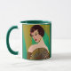 Uma caneca de café numa moderna, semiabstenção, Art Deco inspirou o retrato de uma moça humorística, segurando um fã, contra um pano de fundo verde-jade e dourado