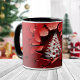 Aqui está uma caneca colorida da época de Natal que seguramente vai chamar a atenção! Uma parede vermelha rachada exibe uma árvore de férias branca com decorações de bolbos vermelhos. Não a sua caneca de Natal comum! Este design parece excelente com alça preta e dentro (mostrado) ou em branco, ou vermelho também.