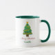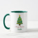Uma caneca com uma Árvore de Natal e suas terras, suas bolas e sua estrela no topo. Vem com um texto personalizável "Feliz Natal" e um nome próprio. Então você poderia usá-lo para seu café no escritório durante o próximo Natal ou oferecê-lo!