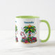 Uma caneca com uma imagem de feriado sazonal. Uma palmeira tropical decorada em luzes festivas com uma estrela no topo. Uma bengala branca e vermelha gigante que sai da areia. Presentes de Natal debaixo da árvore. Whimsical e divertido.