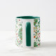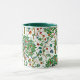 Caneca de café em uma tomada de Nouveau da arte de William Morris "árvore em um teste padrão tradicional da vida", caracterizando as árvores da fantasia cercadas pelos ramos enchidos com as flores exóticas e os pássaros, máscaras do verde esmeralda, tan, ouro, vermelho, e azul de turquesa, em um fundo branco
