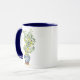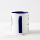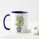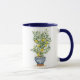 Caneca de café com aquarela ilustrando um limão florescente com limões amarelos vibrantes espalhados pelo verde. A árvore é colocada em um plantador azul e branco. Imagem impressa em ambos os lados. Tamanhos adicionais e jantes e tamanhos de alça disponíveis.