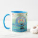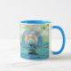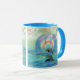2 golfinhos que nadam no oceano perto de uma ascensão bonita das cores e da água com 2 planetas, uma lua e um sol colorido. Cores cor-de-rosa, azuis, do aqua, as amarelas e as verdes na água e no céu.