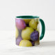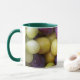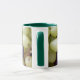 Caneca branca com manípulo e jante verdes escuros, decorada com uma fotografia de frutas de outono.