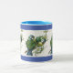Foto maravilhosa de dois pequenos pássaros sentados em um galho com flores, são mostrados nesta caneca de café com jato azul. Brigue sua manhã com esta caneca ou dê como presente!