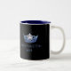 Um impressão azul brilhando da coroa poised a parte dianteira e o centro em cada lado desta caneca do café/cacau. Mostrado em uma caneca preta & branca com um texto azul interior e coordenando do marinho. Personalize seu interior e personalize o texto da amostra ao seus próprios. Mostrado como a senhorita Hamilton 2018.