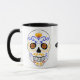 Este dia único do design de caneca morta captura aspectos-chave desta celebração mexicana. Um crânio de açúcar é uma tradição que se destaca nas celebrações do Dia dos Mortos, que começa no final de outubro até o início de novembro. Este design colorido é simplesmente atraente para os olhos, com as cores principais sendo azul e laranja. A caneca pode ser personalizada com um nome ou outro texto no lado frontal.