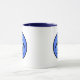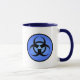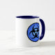 Símbolo de perigo biológico preto num fundo circular azul. Faz uma declaração profunda sobre o café do escritório. Escolha da caneca de viagem de cerâmica, vidro ou aço inoxidável.