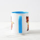 Uma caneca azul e branca com um vermelho, um marrom e um creme de sorriso bonitos coloriu a raposa dos desenhos animados com orelhas pointy e uma grande cauda espessa.