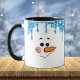 Esta caneca tem um rosto feliz de boneco de neve de dois lados. A parte superior está limitada por gotas de brilho azul cintilante. Seu nome ou outro texto está localizado entre as faces do boneco de neve. Bonito para o Natal e durante todo o inverno.