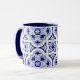 Azulejo azul e branco italiano ou português olha caneca de café. Parte de um jogo correspondente - toalha, cambalheira, relógio e saco de tote.