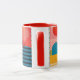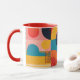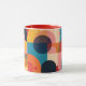 A vibrant abstract geometric composition fills the frame, featuring a tessellation of colorful shapes. Dominant elements include large circles, semicircles, and squares in shades of red, orange, yellow, blue, pink, and dark navy. Some shapes are solid, while others feature textured patterns like fine lines, cross-hatching, or subtle speckles.