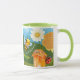 Esta linda caneca apresenta um monte de abelhas, favos de mel, girassóis, frutas e um fluxo pacífico. A caneca de dois lados conta uma história de uma vida ocupada versus uma vida descansada, do ponto de vista de Salm 23:2b e 3a. O texto é feito em mandarim chinês Pinyin.