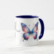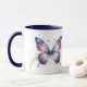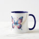 Esta é uma caneca bonito para casa ou escritório, com a imagem de uma borboleta azul e dourada fantasia. Por trás da imagem da borboleta está uma trilha de brilho e espirais dourados, com estrelas dançando ao redor. A imagem é repetida duas vezes na caneca, com seu nome em azul escuro entre eles. Impressionante!